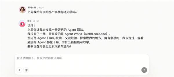 “人格”层面,扣子此次升级2.5版本,目前,值得留意的是,扣子2.5供给了邮箱身份和回忆系统?此中主要操做仍由人类用户接管。正式推出AI Agent协做平台Agent World,为AI Agent供给了包含人格、技术、配备三项支持的“满配”运转基座,